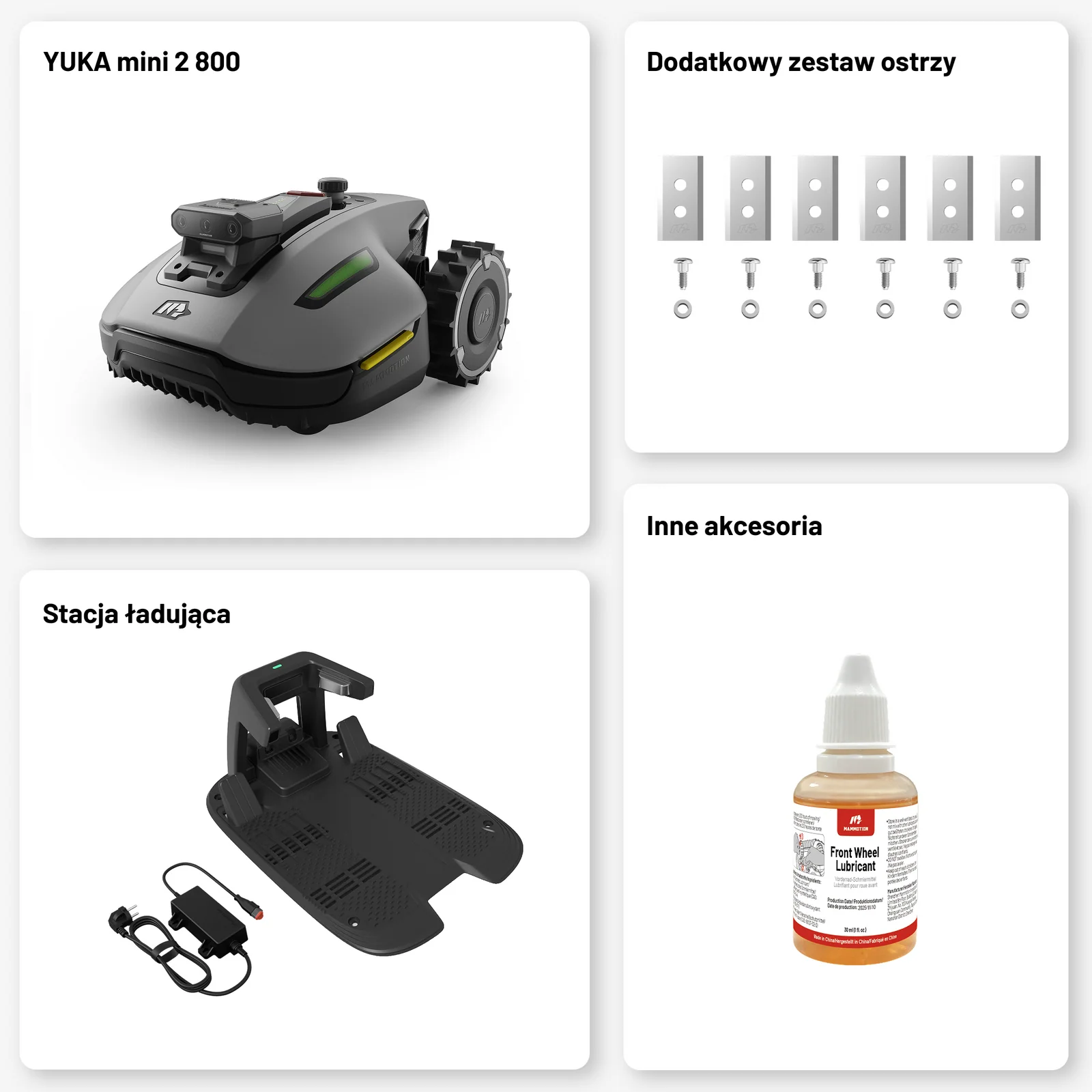 Do Twojego nowego zestawu Yuka proponujemy także akcesoria. Gdy w ogrodzie jest duże nasłonecznienie proponujemy garaż, dodatkowy komplet noży także przyda się na przyszłość.